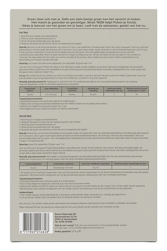 Pokon Mos en Onkruid Weg! is een pakket met zowel een gazonvoeding met onkruidbestrijder als een gazonvoeding met mosbetrijder. Door mos en onkruid verstikt het gras waardoor het gazon wordt verstoord. Pokon Mos Weg! geeft voeding aan het gazon en werkt snel en effectief tegen mossen in gazons. De gazonmest bevat essentiële voedingsstoffen die ervoor zorgen dat het gazon beter bestand is tegen mos. Mos kun je het beste behandelen van maart t/m mei en van september t/m december (niet in de zomer toepassen). Voor een optimale behandeling is het belangrijk dat de grond niet bevroren is, dat er geen zware regen wordt verwacht en dat de buitentemperatuur niet te hoog is (het gras kan verbranden). Maai het gazon de eerste 4 dagen na toepassing niet. Binnen een week zal het mos zwart/bruin worden en afsterven. Na twee weken kan het dode mos worden verwijderd, bij voorkeur door middel van verticuteren. Indien noodzakelijk kan de behandeling na 90 dagen worden herhaald.